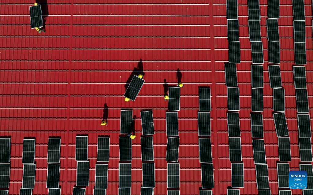 This aerial photo shows workers installing photovoltaic power panels on the roof of a factory in Tangshan, north China's Hebei Province, Oct. 11, 2022. (Xinhua/Yang Shiyao)
