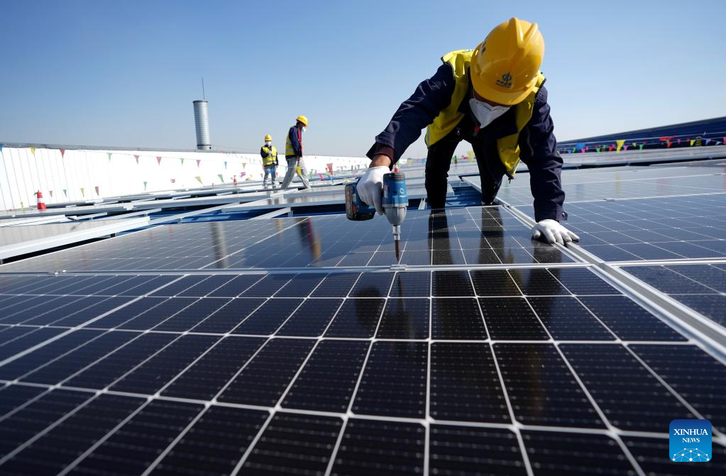 A worker installs photovoltaic power panels on the roof of a factory in Tangshan, north China's Hebei Province, Oct. 11, 2022. (Xinhua/Yang Shiyao)
