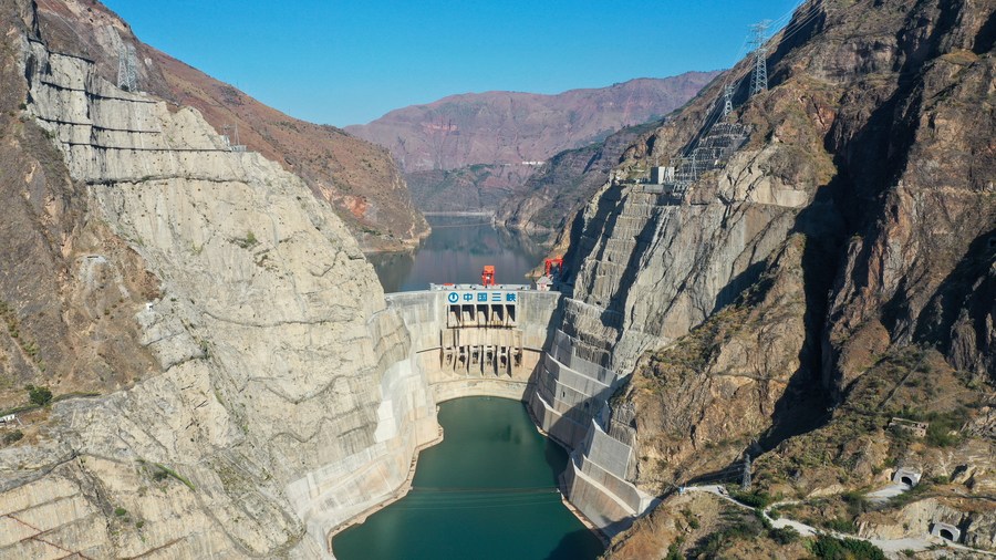 This aerial photo taken on Nov. 25, 2022 shows the Wudongde hydropower station on the border of Sichuan and Yunnan provinces in southwest China. (Xinhua/Xu Bingjie)