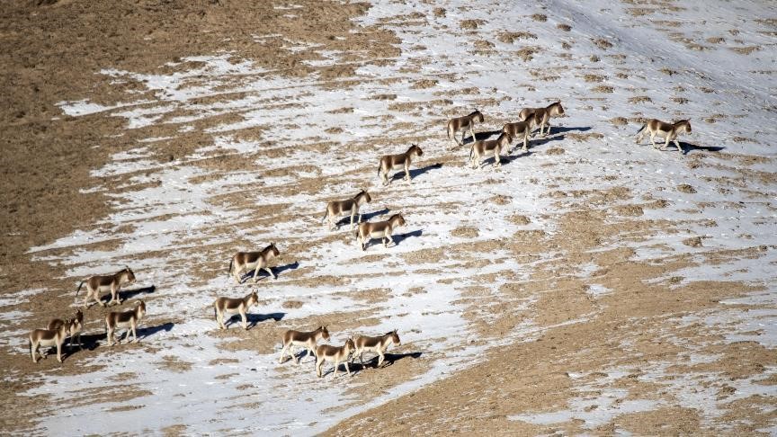 Photo taken on Dec. 17, 2022 shows a herd of kiangs strolling on the Haltent grassland in the Kazak autonomous county of Aksay, northwest China's Gansu province. (People's Daily Online/Gao Hongshan)