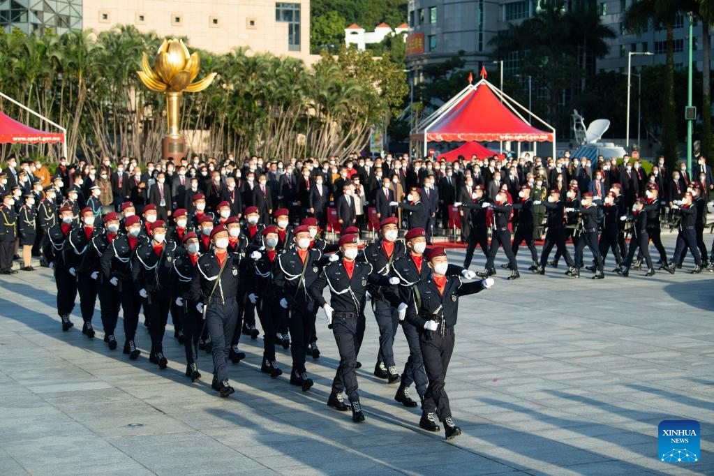 A flag-raising ceremony marking the 23rd anniversary of Macao's return to the motherland is held at the Golden Lotus Square in Macao, south China, Dec. 20, 2022. (Xinhua/Cheong Kam Ka)