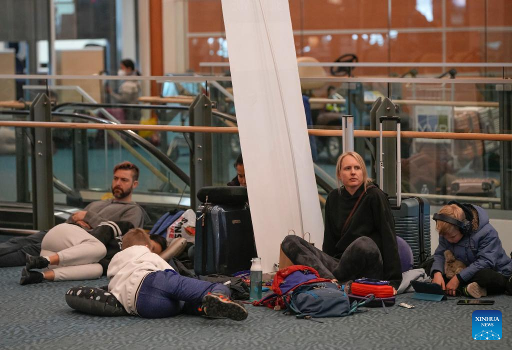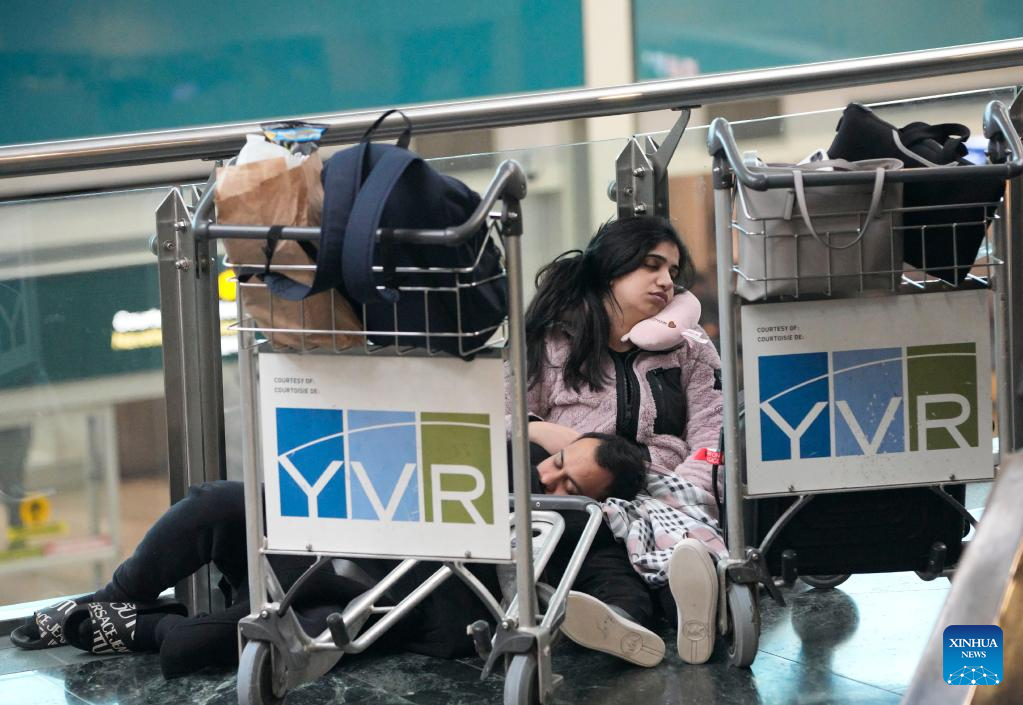 People sleep on the floor at Vancouver International Airport in Richmond, British Columbia, Canada, on Dec. 20, 2022. (Photo by Liang Sen/Xinhua)