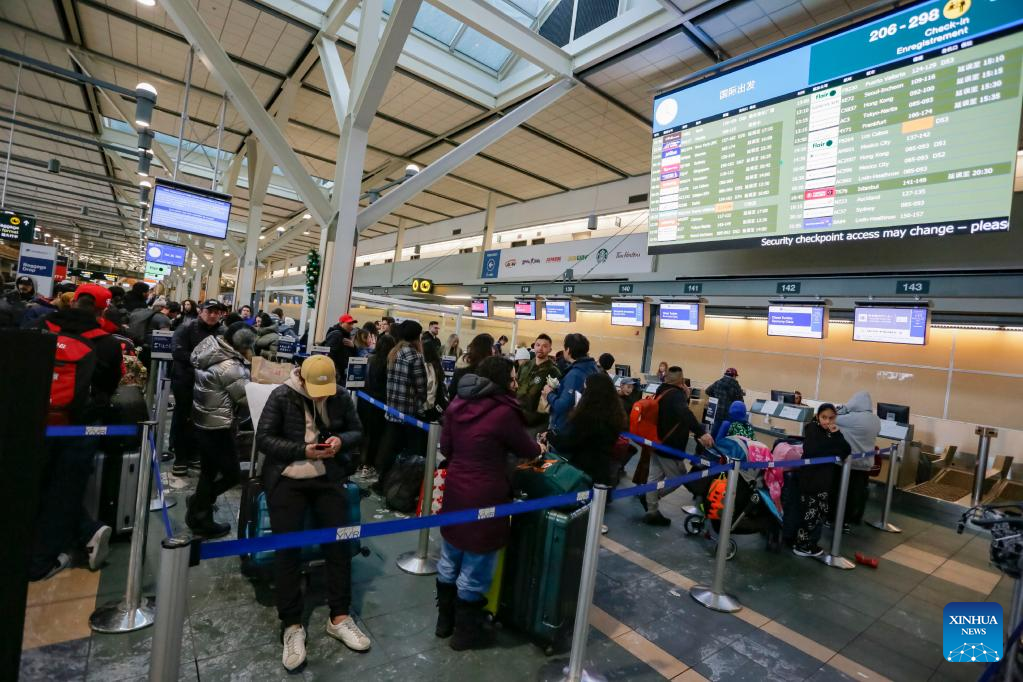 Passengers wait in a check-in line at Vancouver International Airport in Richmond, British Columbia, Canada, on Dec. 20, 2022. (Photo by Liang Sen/Xinhua)