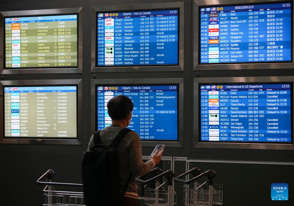A passenger reads flight information at Vancouver International Airport in Richmond, British Columbia, Canada, on Dec. 20, 2022. (Photo by Liang Sen/Xinhua)