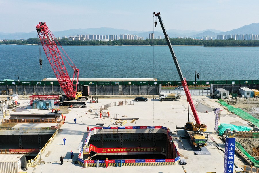 This aerial photo taken on Oct. 24, 2022 shows the construction site of Qinwang tunnel project in Fuyang District of Hangzhou, east China's Zhejiang Province. (Xinhua/Huang Zongzhi)