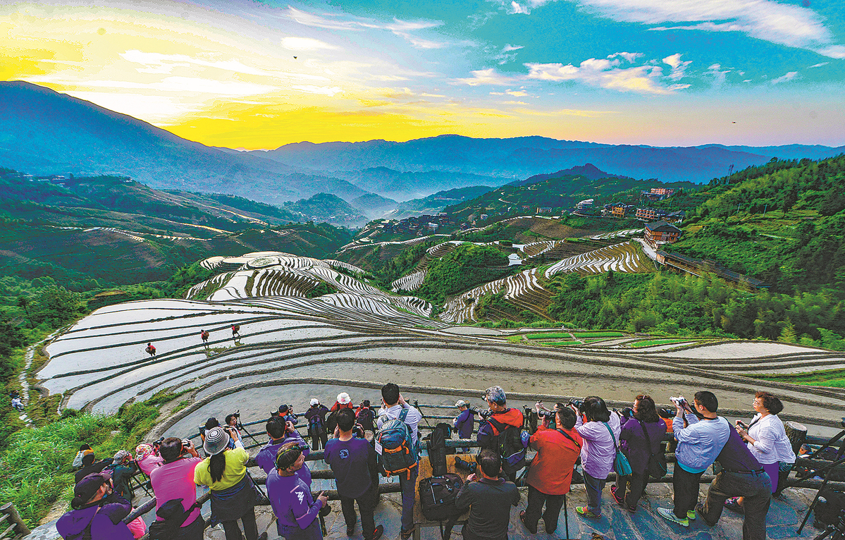 Tourists enjoy a panoramic view of Dazhai village in Longsheng, Guangxi Zhuang autonomous region, in spring. PAN ZHIXIANG/FOR CHINA DAILY