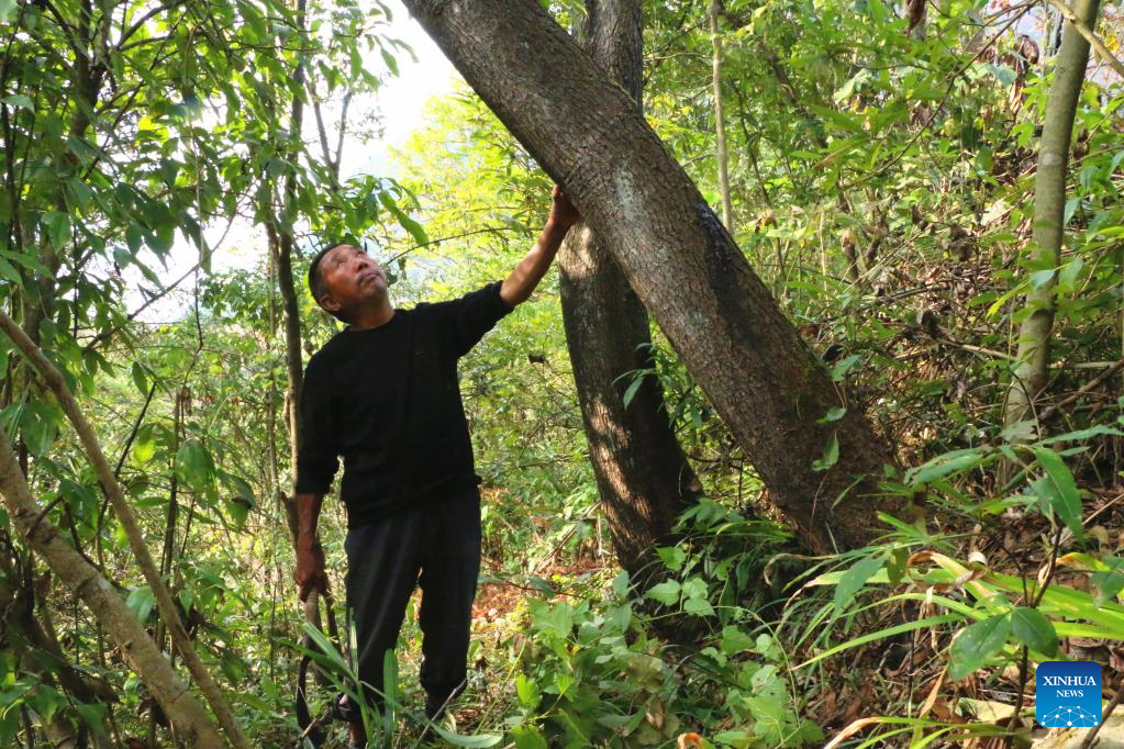 Cheng Delin checks the growth of trees in Zhoujia'ao Village, Chanxi Township, Yinjiang Tujia and Miao Autonomous County, southwest China's Guizhou Province, Nov. 8, 2022.(Xinhua)