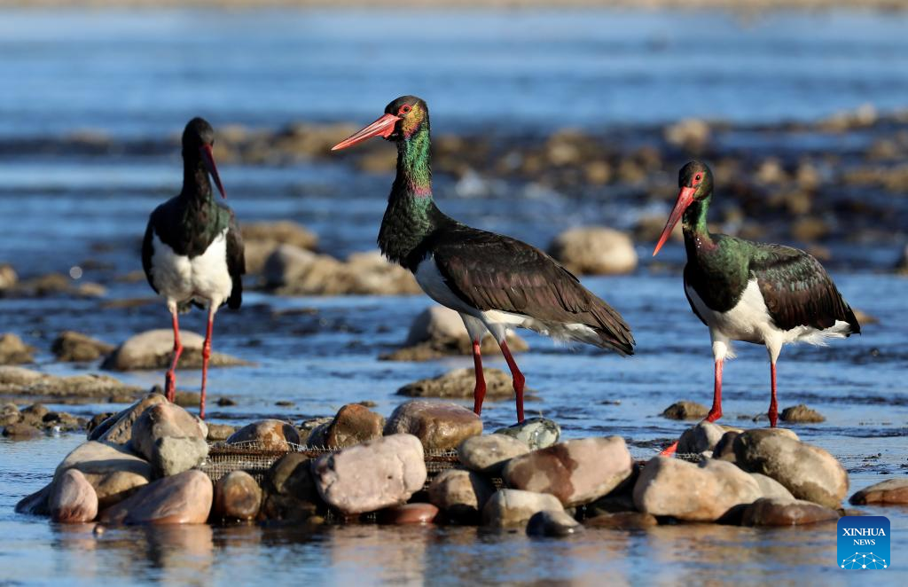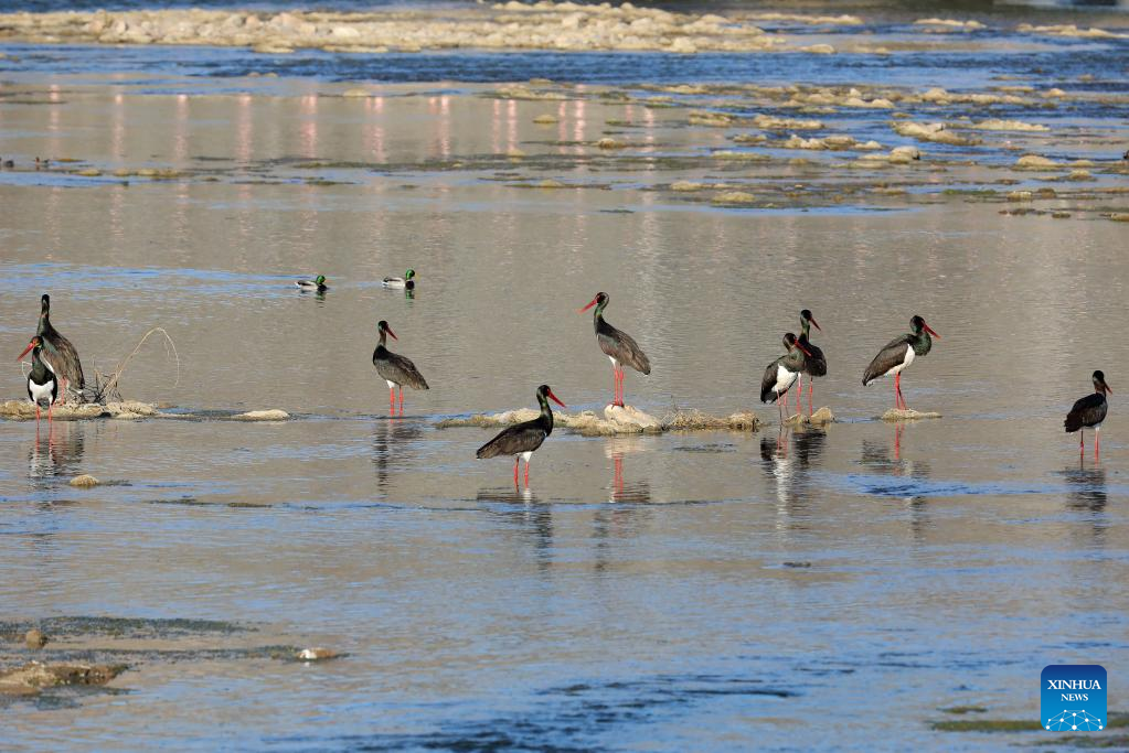 Black storks forage at Mianman River in Jingxing County, north China's Hebei Province, Dec. 22, 2022. (Xinhua/Yang Shiyao)