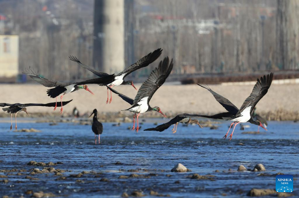 Black storks frolic at Mianman River in Jingxing County, north China's Hebei Province, Dec. 22, 2022. (Xinhua/Yang Shiyao)