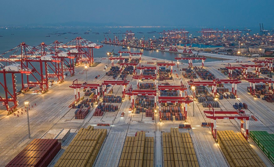 The fully automated terminal of Nansha port starts operation in Guangzhou, capital of south China's Guangdong province, in July 2022. In this picture, bridge cranes, rail-mounted gantry cranes and automated guide vehicles work in an orderly manner at the terminal under an intelligent control system. (People's Daily Online/Qiu Xinsheng)