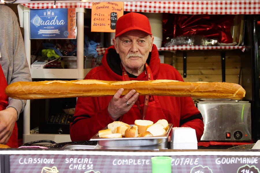 A vendor shows a baguette at a Christmas market in Brussels, Belgium, on Dec. 22, 2022. (Xinhua/Zheng Huansong)