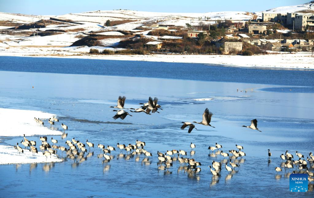 Black-necked cranes are pictured at the Yunnan Dashanbao National Nature Reserve for Black-necked Cranes in Zhaotong City, southwest China's Yunnan Province, Dec. 18, 2022.(Photo by Wu Taiping/Xinhua)