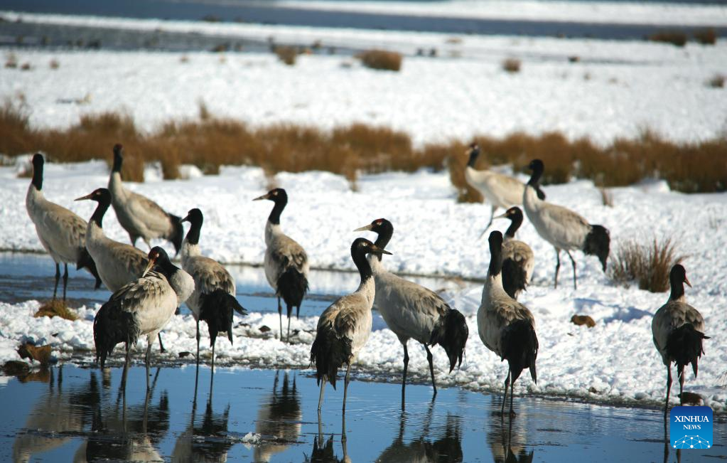 Black-necked cranes are pictured at the Yunnan Dashanbao National Nature Reserve for Black-necked Cranes in Zhaotong City, southwest China's Yunnan Province, Dec. 17, 2022. (Photo by Wu Taiping/Xinhua)