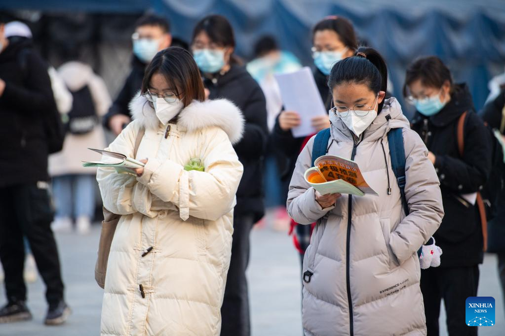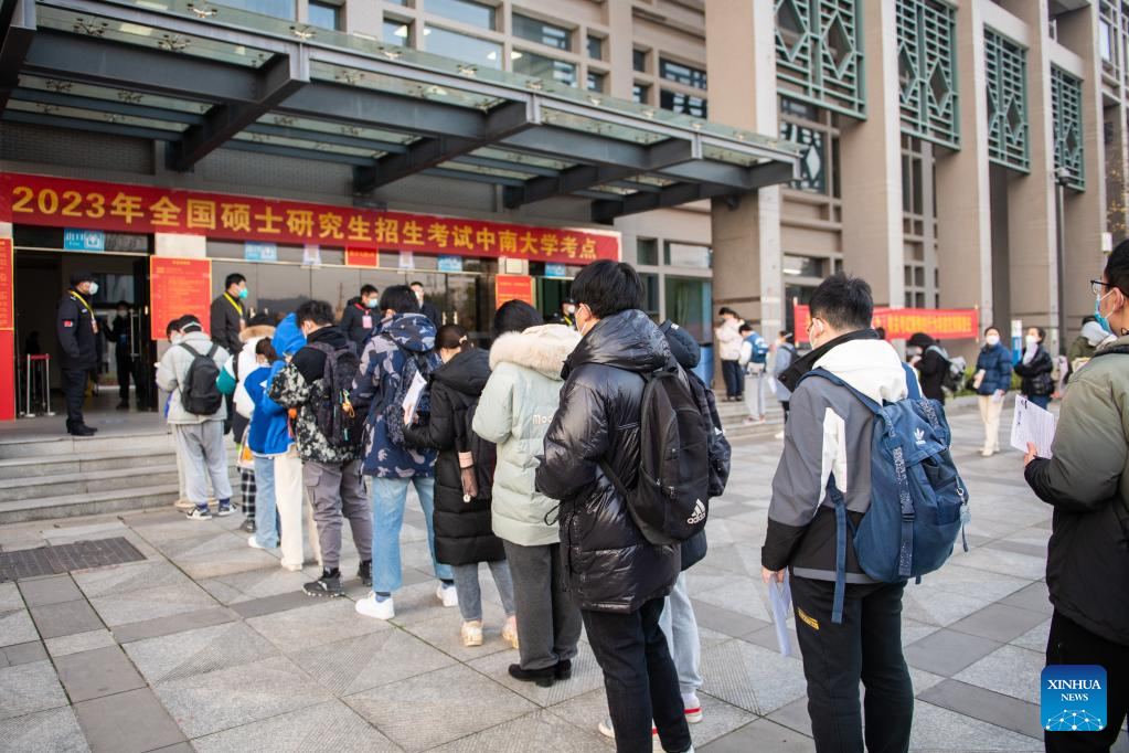 Examinees line up to enter the examination sites at Central South University in Changsha, central China's Hunan Province, Dec. 24, 2022. China's annual graduate school entrance exam kicked off on Saturday. (Xinhua/Chen Sihan)