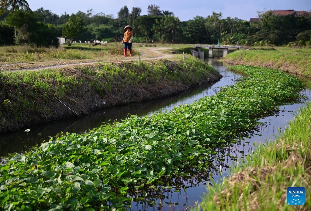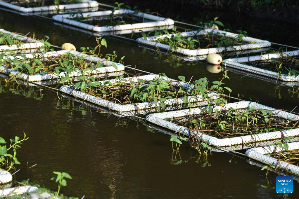 This photo taken on Dec. 24, 2022 shows artificial floating islands installed on a tributary of the Baoling River in Wenchang, south China's Hainan Province. (Xinhua/Pu Xiaoxu)