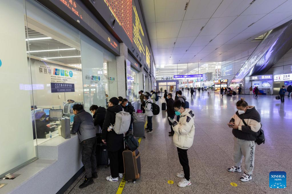 Travellers line up in front of the ticketing office at the Shanghai Hongqiao Railway Station in east China's Shanghai, Dec. 24, 2022. (Xinhua/Wang Xiang)