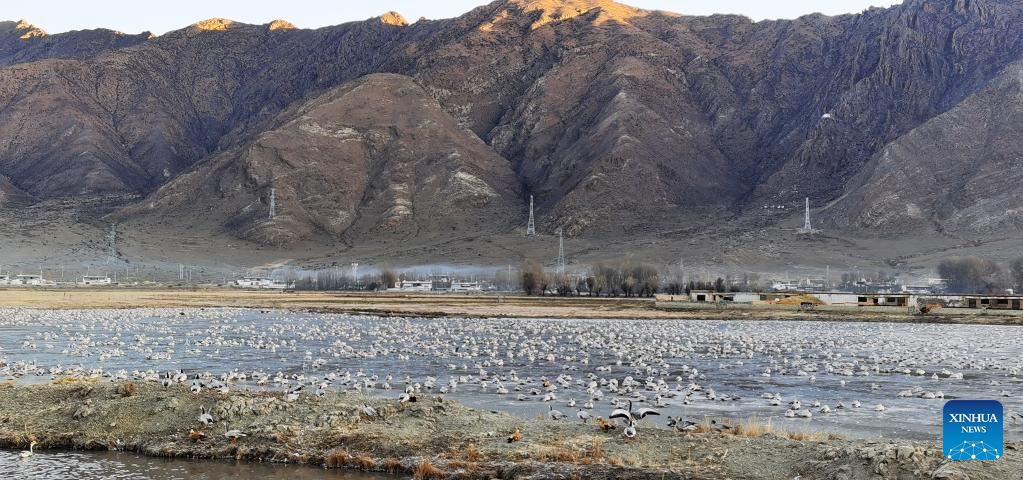 This photo taken by mobile phone on Dec. 24, 2022 shows migratory birds in Lhunzhub County of Lhasa, capital of southwest China's Tibet Autonomous Region. (Xinhua/Shen Hongbing)