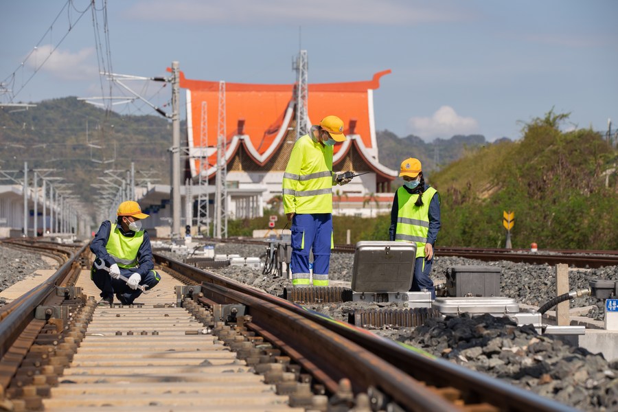 Chinese and Lao staff members maintain the railway in Luang Prabang, Laos, Dec. 1, 2022. (Photo by Kaikeo Saiyasane/Xinhua)