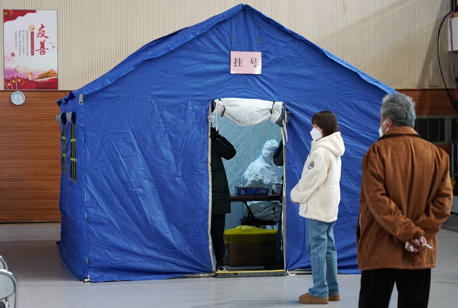 People line up to seek medical advice in a makeshift fever clinic in Guang'an Gymnasium in Beijing, capital of China, Dec. 24, 2022.(Xinhua/Zhang Chenlin)