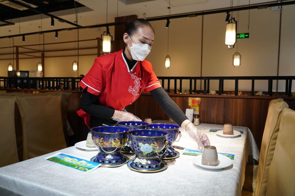 A waitress sets the table at a restaurant of a shopping mall in Beijing, capital of China, Dec. 25, 2022. (Xinhua/Ren Chao)