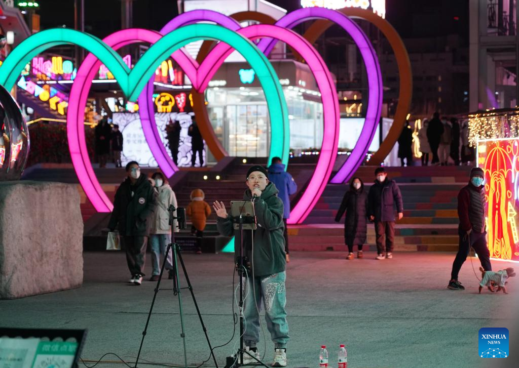 A singer performs at a business center in Beijing, capital of China, Dec. 25, 2022. (Xinhua/Zhang Chenlin)