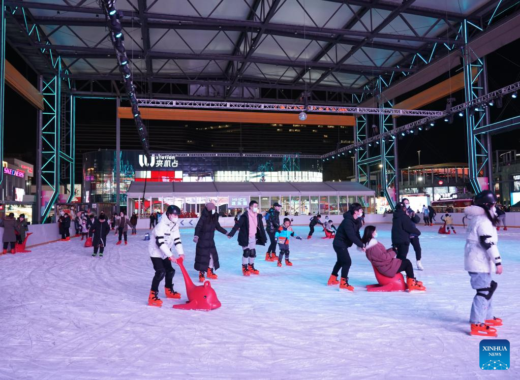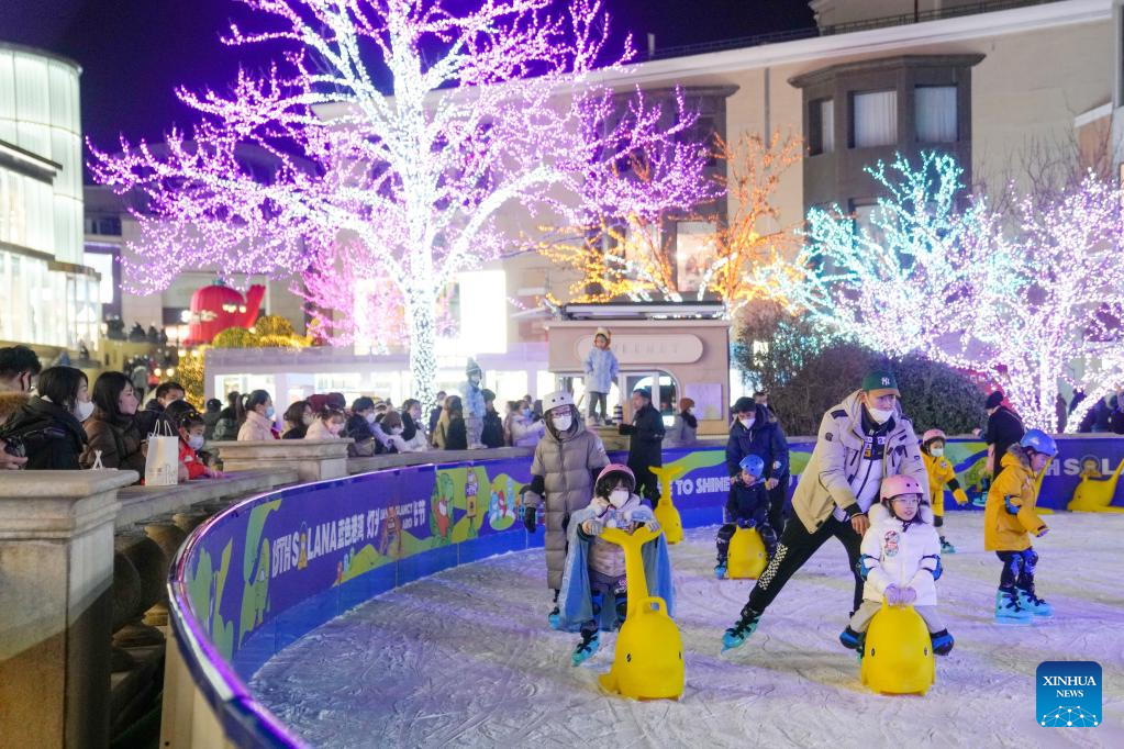 People skate at a business center in Beijing, capital of China, Dec. 25, 2022. (Xinhua/Zhang Chenlin)