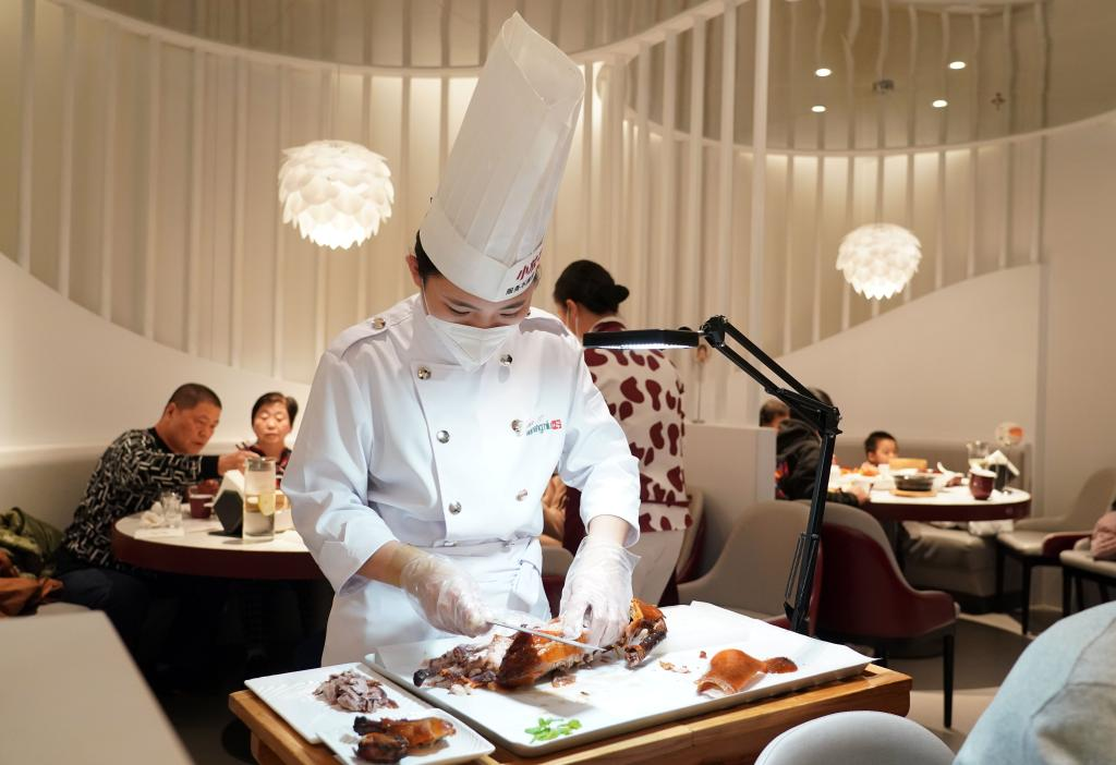 A cook serves roast duck for customers at a restaurant of a shopping mall in Beijing, capital of China, Dec. 25, 2022. (Xinhua/Ren Chao)