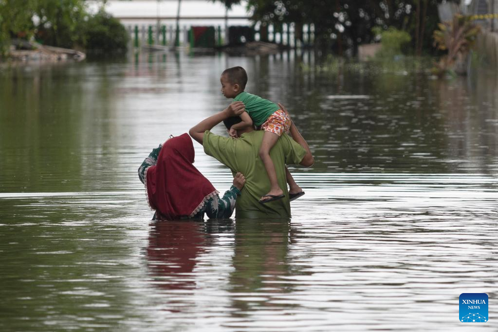 People wade through flood water after heavy rain in Makassar, South Sulawesi, Indonesia, Dec. 26, 2022. (Photo by Niaz Sharief/Xinhua)