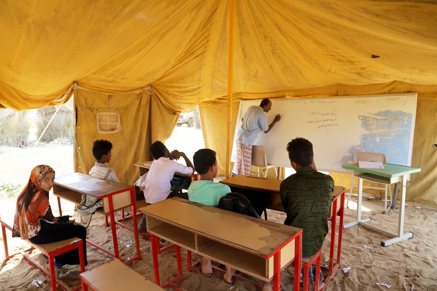 Students attend a class inside a makeshift classroom in Hajjah province, northwestern Yemen, on Oct. 23, 2022. (Photo by Mohammed Al-Wafi/Xinhua)
