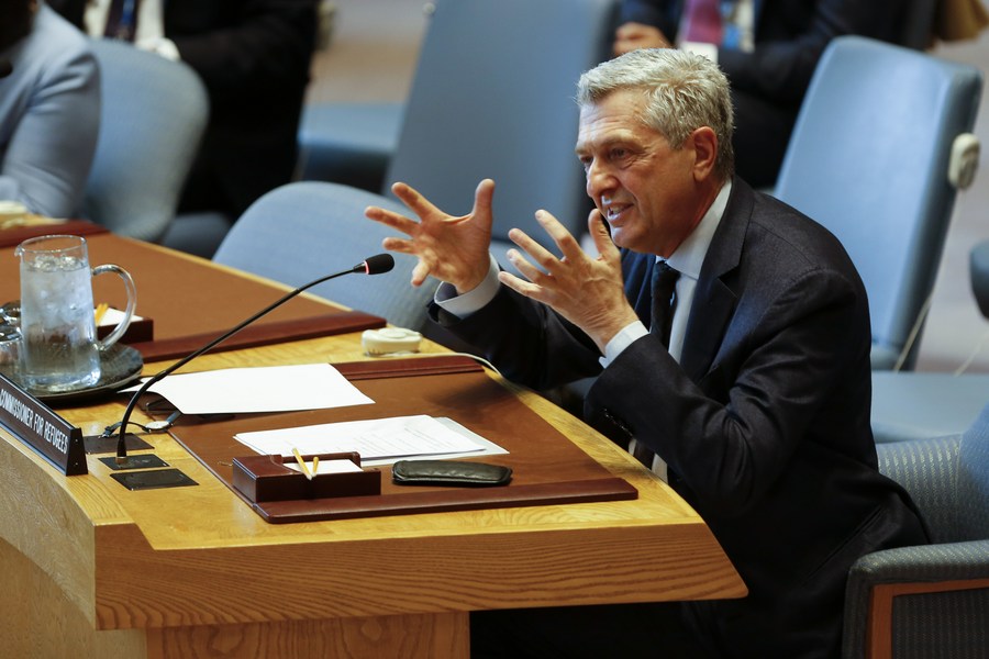 United Nations High Commissioner for Refugees (UNHCR) Filippo Grandi briefs the UN Security Council on the state of the world's displaced people, at the UN headquarters in New York, on April 9, 2019. (Xinhua/Li Muzi)