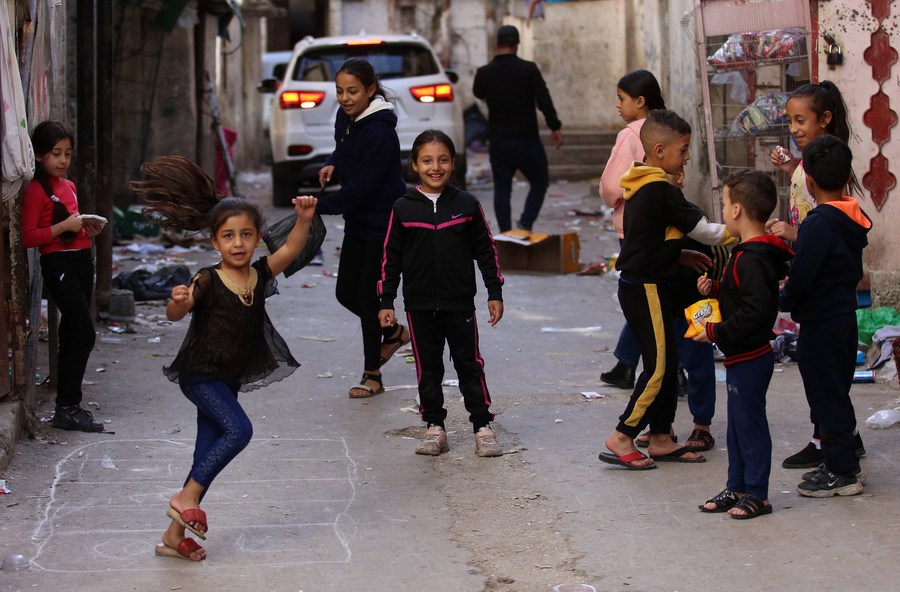 Children are pictured on a street in Balata refugee camp near the West Bank city of Nablus, Nov. 20, 2022. (Photo by Nidal Eshtayeh/Xinhua)
