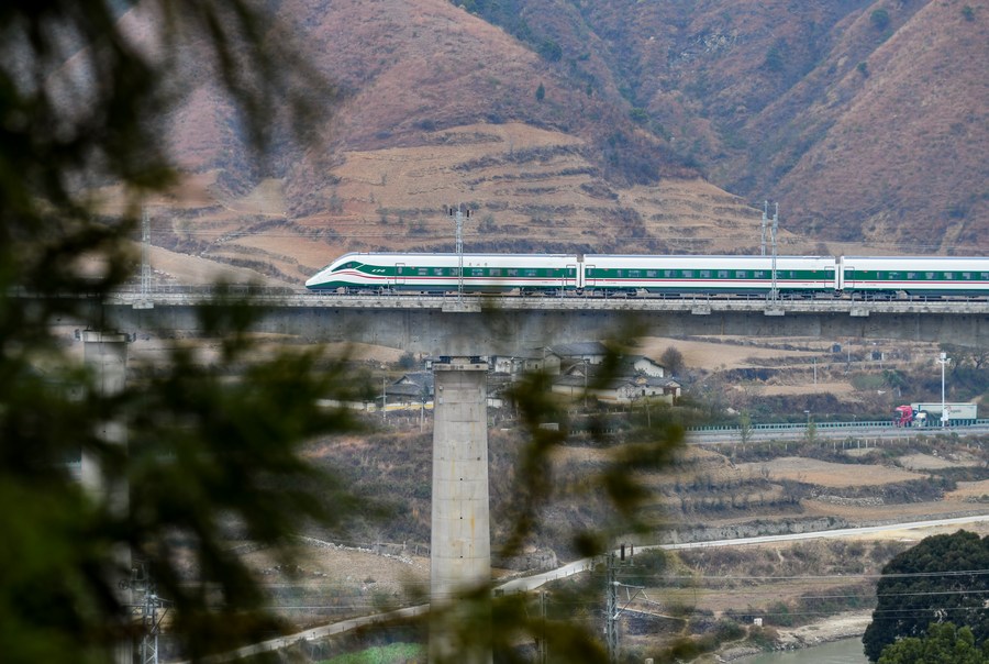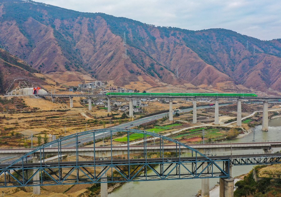 A Fuxing high-speed train makes a trial run before the opening of the new Chengdu-Kunming Railway in Mianning County, southwest China's Sichuan Province, Dec. 24, 2022. (Xinhua/Wang Xi)