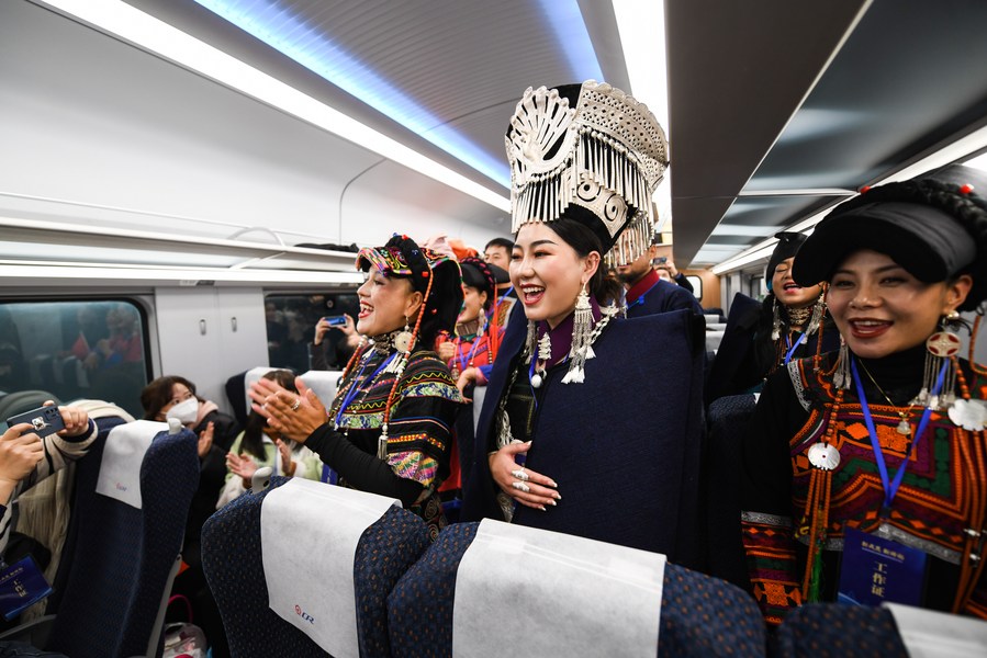 People of Yi ethnic group perform on a Fuxing bullet train coded C57 running on the new Chengdu-Kunming Railway in southwest China, Dec. 26, 2022. (Xinhua/Wang Xi)