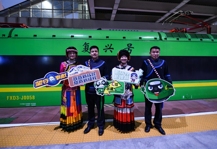 People of Yi ethnic group pose for a group photo before the departing of a Fuxing bullet train coded C57 on the new Chengdu-Kunming Railway at Chengdu South Railway Station in Chengdu, southwest China's Sichuan Province, Dec. 26, 2022. (Xinhua/Wang Xi)