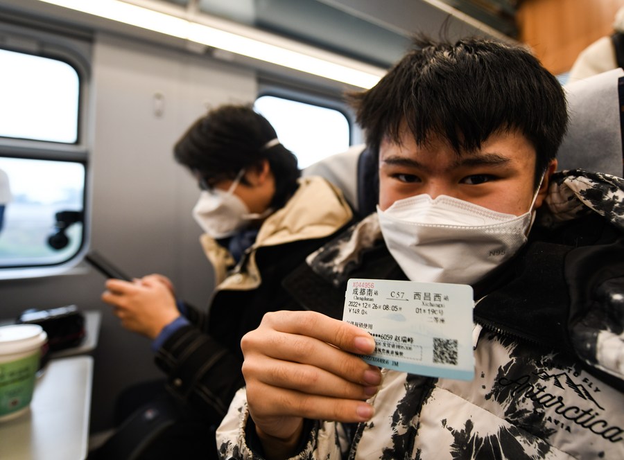 A passenger shows a ticket at a Fuxing bullet train coded C57 on the new Chengdu-Kunming Railway in southwest China, Dec. 26, 2022. (Xinhua/Wang Xi)