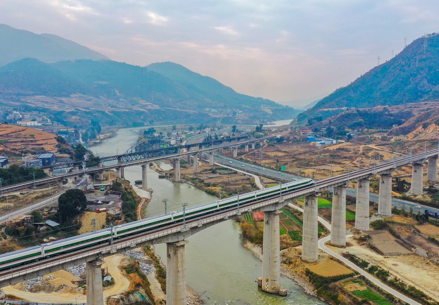 This aerial photo taken on Dec. 24, 2022 shows a Fuxing high-speed train making a trial run before the opening of the new Chengdu-Kunming Railway in Mianning County, southwest China's Sichuan Province. (Xinhua/Wang Xi)
