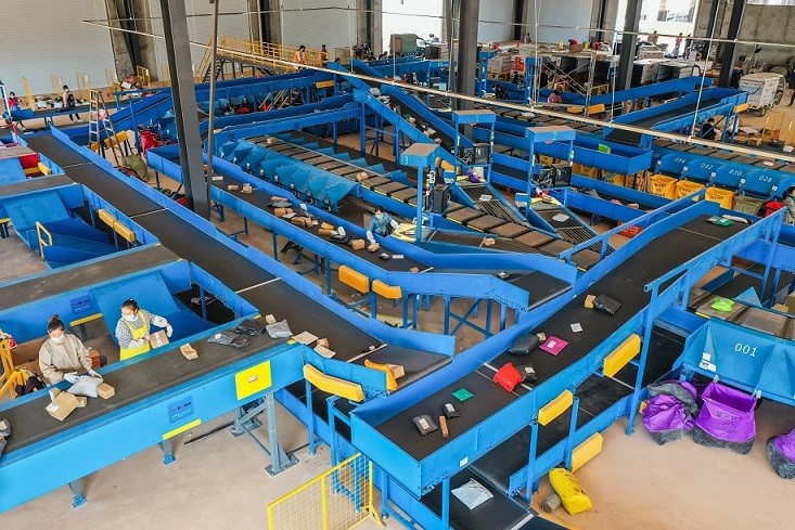 Express delivery parcels are sorted by a smart system in a logistics park in Lanshan county, Yongzhou, central China's Hunan province, October 2022. (People's Daily Online/Peng Hua)