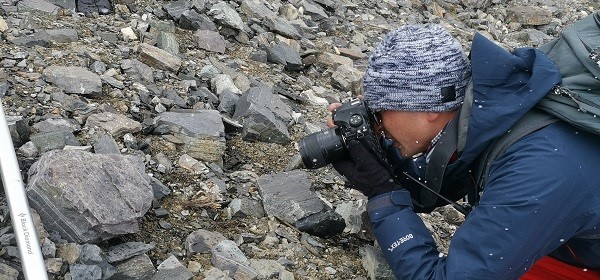 A member of a team tasked with a seed-collection mission on Mount Qomolangma by the Germplasm Bank of Wild Species in the Kunming Institute of Botany under the Chinese Academy of Sciences in Kunming, the capital of southwest China's Yunnan province, takes pictures of a plant he finds on Mount Qomolangma. (Photo courtesy of Kunming Institute of Botany, Chinese Academy of Sciences)