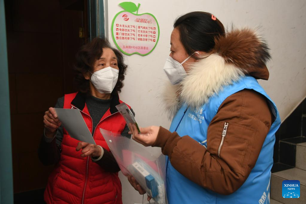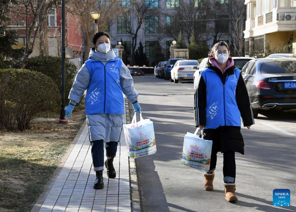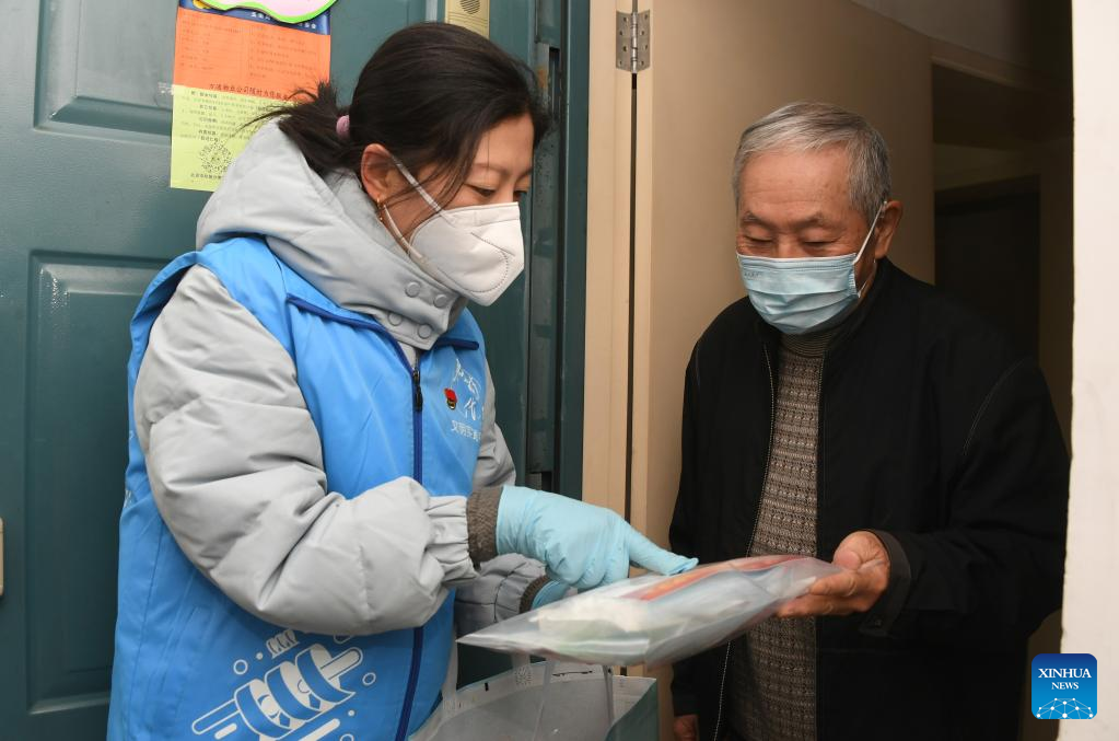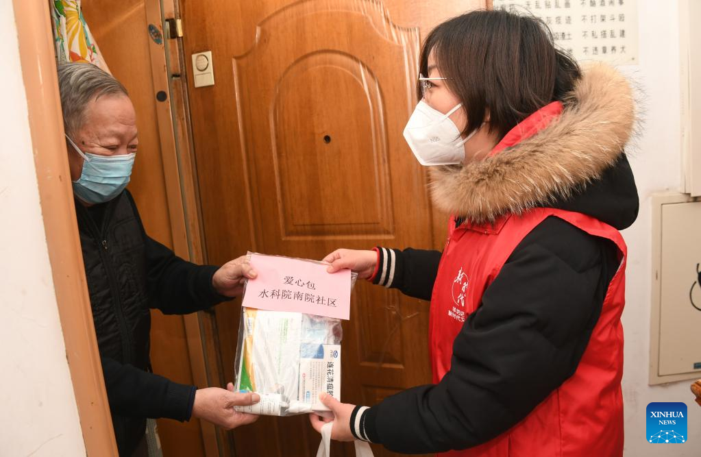 Community workers deliver care packages to senior residents in a community in Yangfangdian Subdistrict of Haidian District in Beijing, capital of China, Dec. 27, 2022. (Xinhua/Ren Chao)