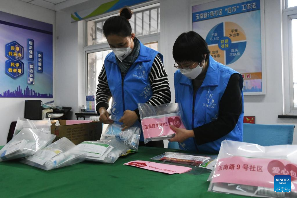 Community workers prepare care packages in a residential community in Yangfangdian Subdistrict of Haidian District in Beijing, capital of China, Dec. 27, 2022. (Xinhua/Ren Chao)