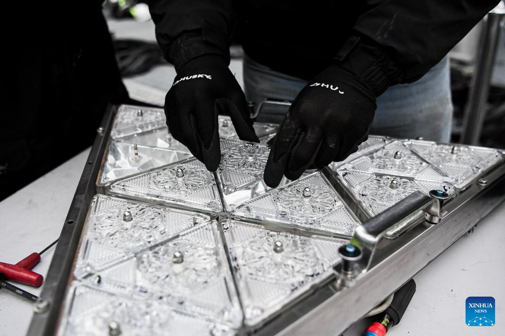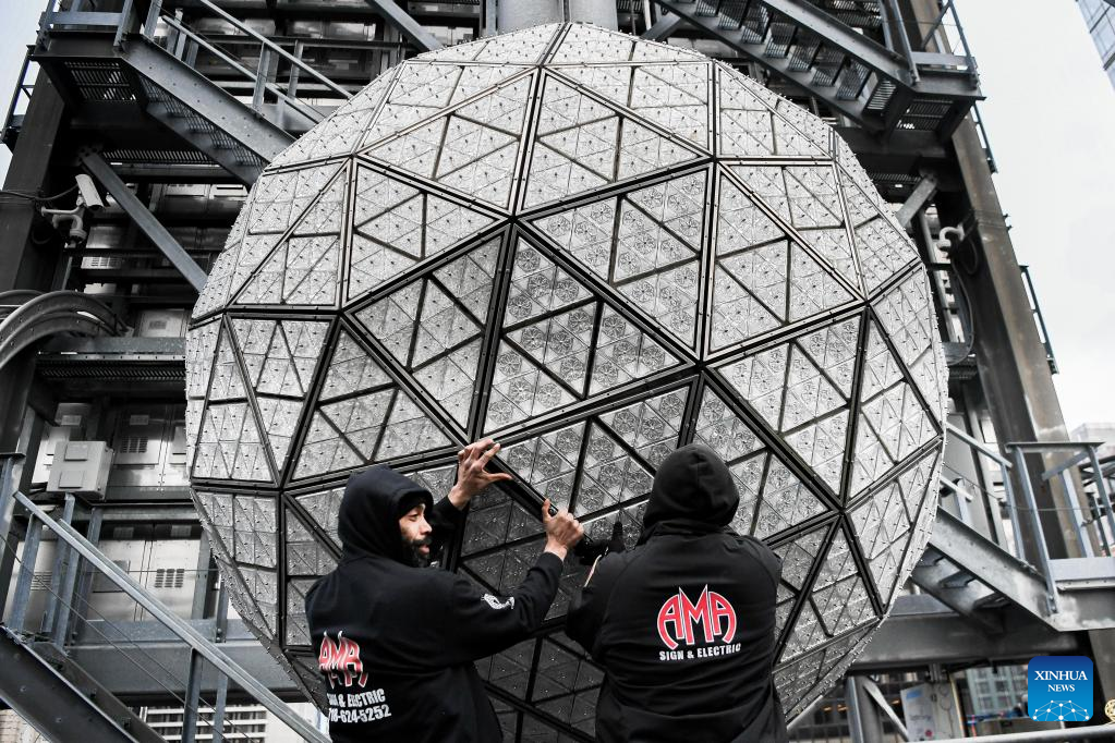 A piece of crystal is put into a larger pattern during the Crystal Times Square New Year's Ball assembly on the roof of One Times Square, New York, the United States, on Dec. 27, 2022. (Photo by Ziyu Julian Zhu/Xinhua)