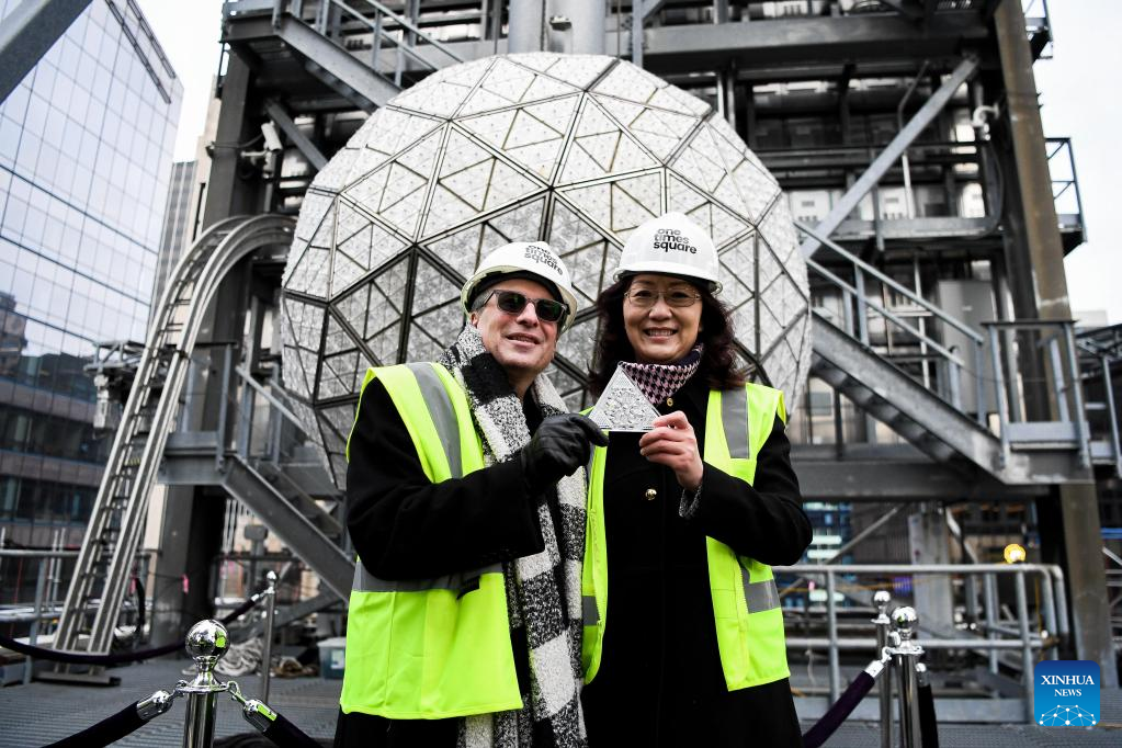 Jeff Straus (L), president of Countdown Entertainment, poses for a picture with Li Li, executive vice president of the Sino-American Friendship Association, during the Crystal Times Square New Year's Ball assembly on the roof of One Times Square, New York, the United States, on Dec. 27, 2022. (Photo by Ziyu Julian Zhu/Xinhua)