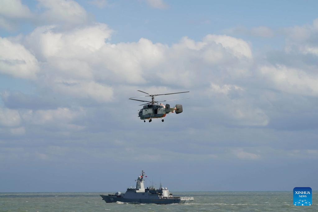 A warship and a helicopter from Russian navy are pictured after a joint naval exercise, Joint Sea 2022, in the East China Sea on Dec. 27, 2022. (Xinhua/Li Bingxuan)