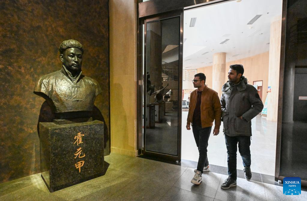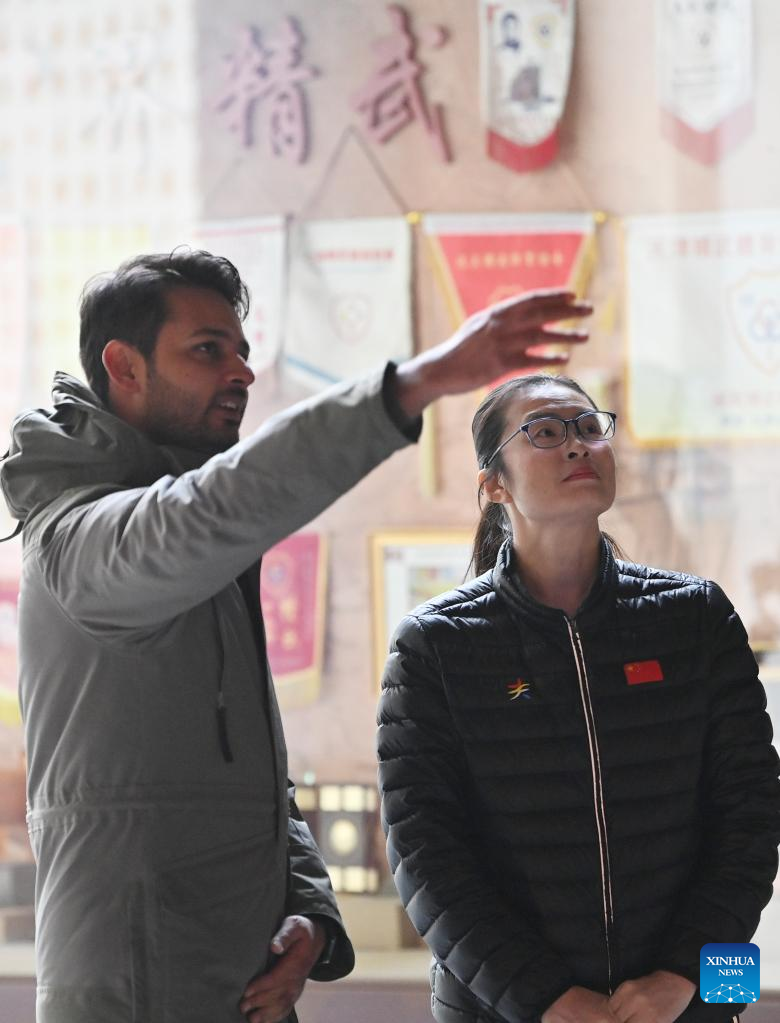 Muhammad Nabil (R) visits a memorial hall commemorating Kung Fu legend Huo Yuanjia with his friend in Jingwu Town of Xiqing District in north China's Tianjin, Dec. 25, 2022. (Xinhua/Sun Fanyue)