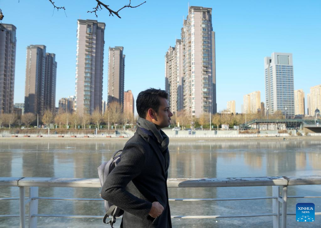 Muhammad Nabil walks along Haihe River in north China's Tianjin, Dec. 26, 2022. (Xinhua/Sun Fanyue)