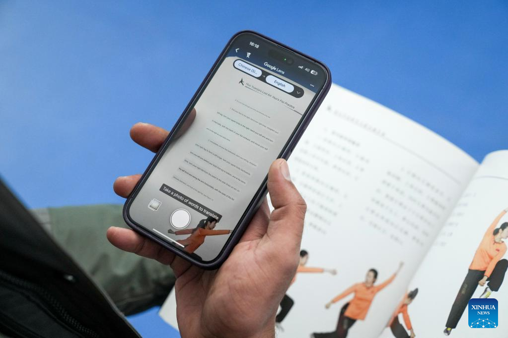 Muhammad Nabil reads a Chinese book about Huo-style boxing with translation software at a martial arts gym in Xiqing District, north China's Tianjin, Dec. 25, 2022. (Xinhua/Sun Fanyue)