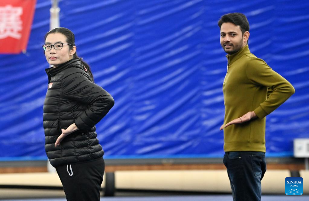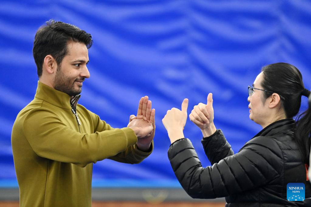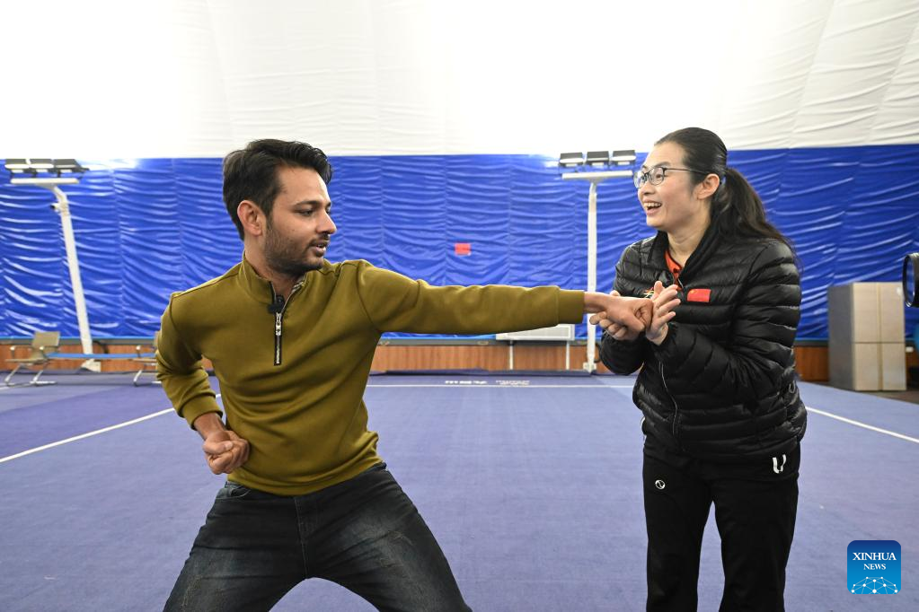 Muhammad Nabil (L) learns Huo-style boxing from Huo Jinghong at a martial arts gym in Xiqing District, north China's Tianjin, Dec. 25, 2022. (Xinhua/Sun Fanyue)