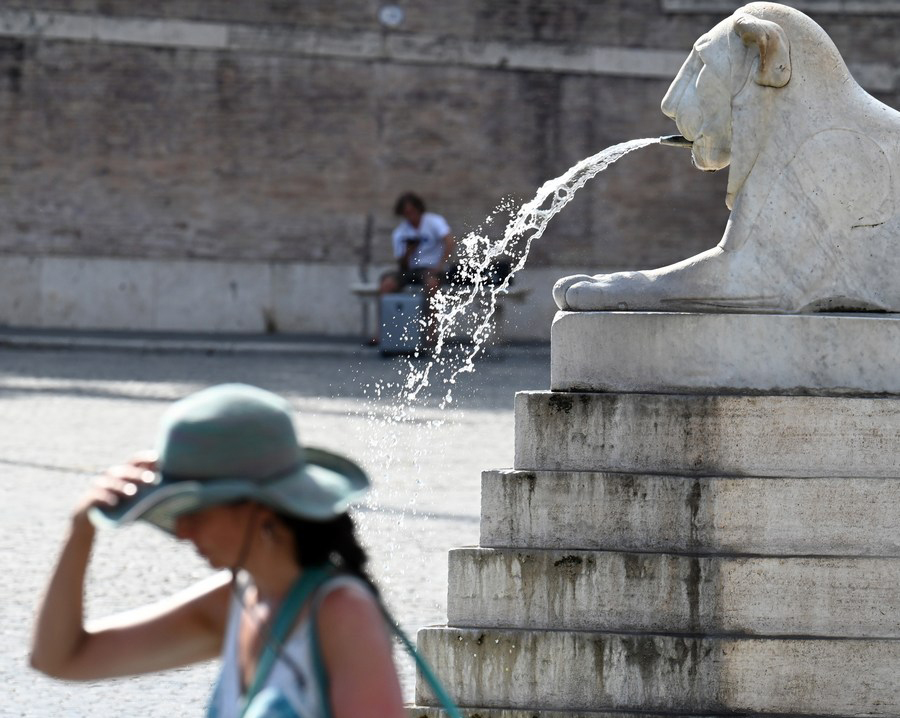 A tourist walks past a fountain at Piazza del Popolo in Rome, Italy on Aug. 5, 2022. (Photo by Alberto Lingria/Xinhua)