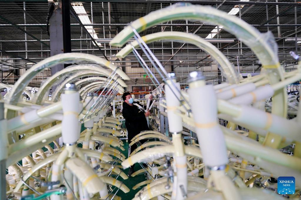 A worker is seen busy on the production line at a factory of a bicycle and baby stroller manufacturer in Pingxiang County, north China's Hebei Province, Dec. 27, 2022. (Xinhua/Mu Yu)