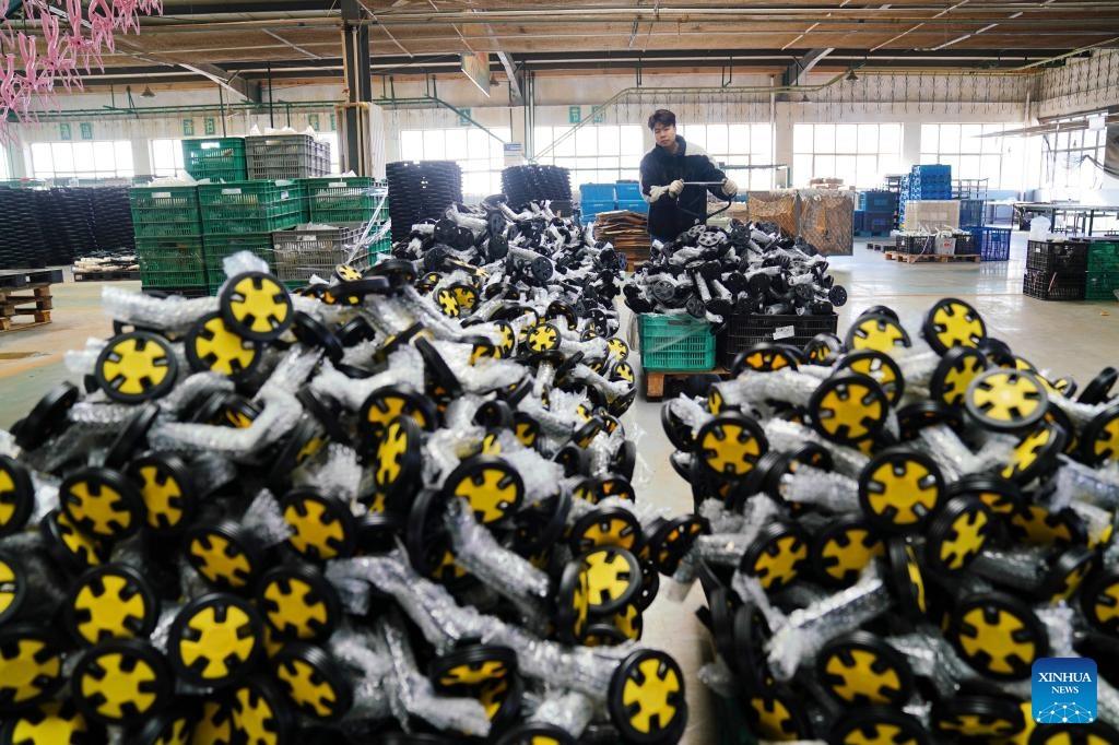 A worker transports tyres at a factory of a bicycle and baby stroller manufacturer in Pingxiang County, north China's Hebei Province, Dec. 27, 2022. (Xinhua/Mu Yu)